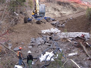 This system has proven very effective at dewatering the work area and reducing sediment delivery into the North Saskatchewan River. Although, as the work was carried out late in the year, problems associated with freezing of water in the plastic pipes was encountered toward the end of the project. |